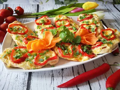 kurczaka zapiekany z serkami oraz papryką, wyrazistego smaku nadaje papryczka