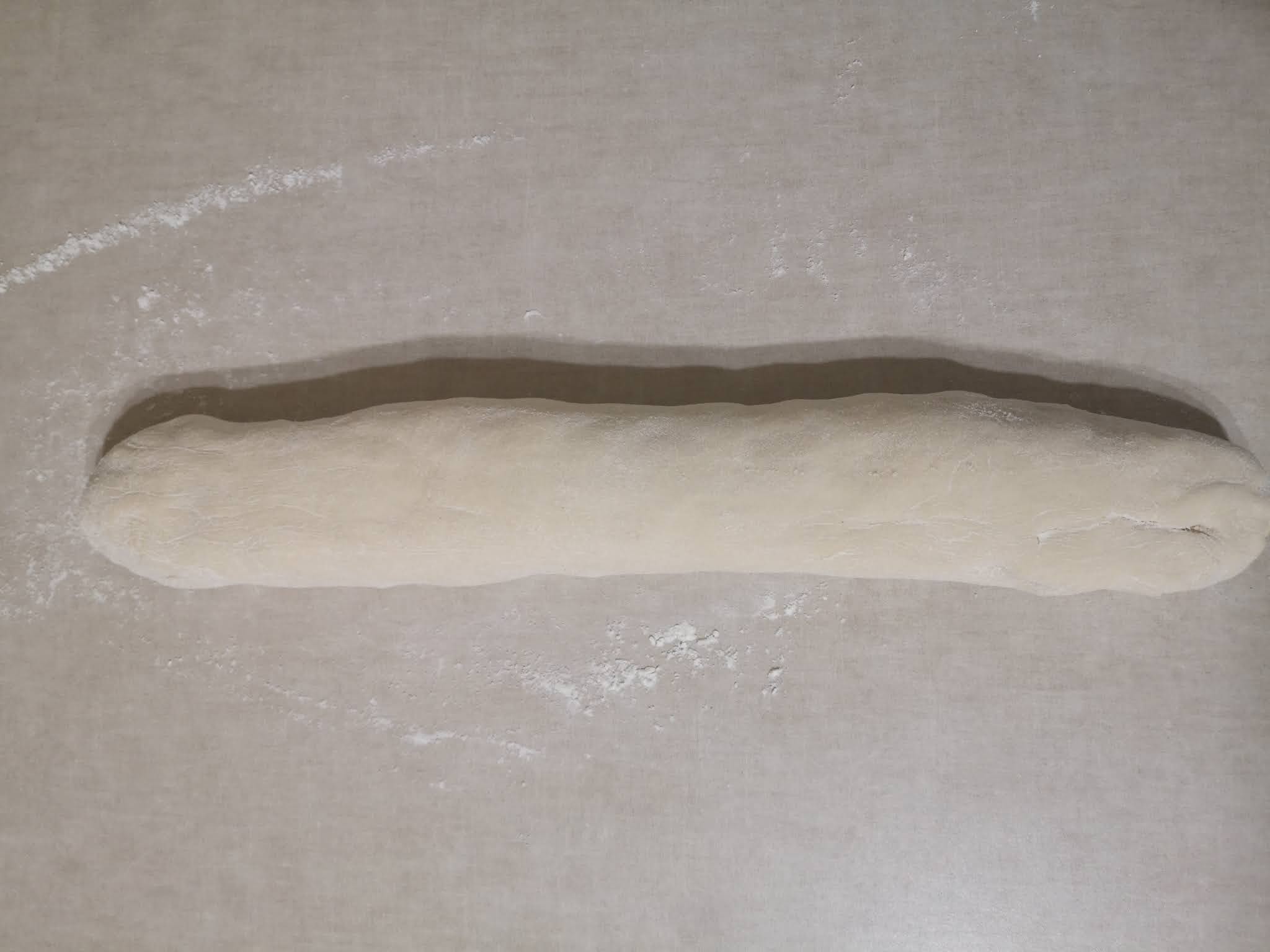 ciasta wałek, który dzielimy na 8 części, następnie okrągłe placki. Układamy na